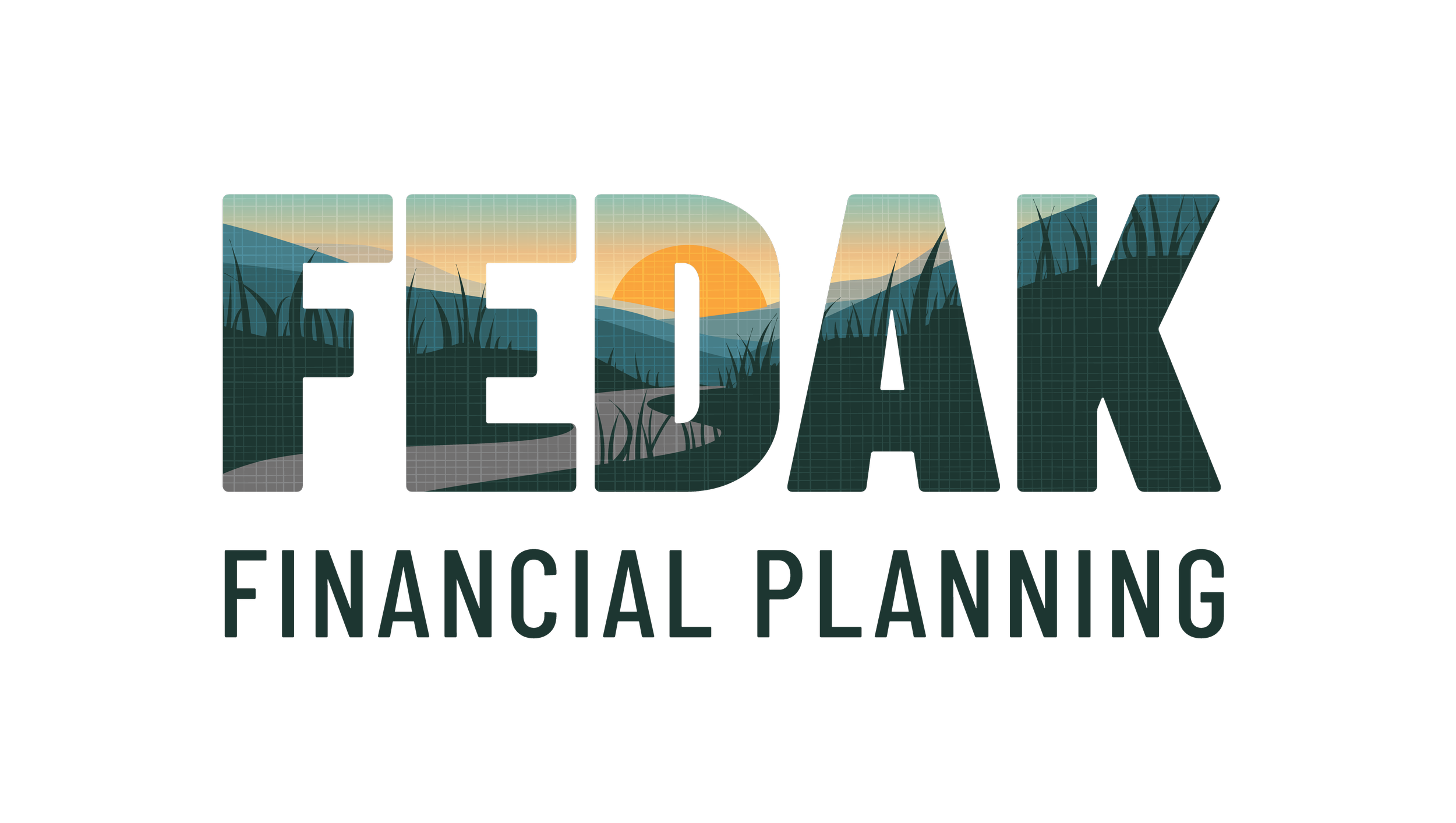 The Fedak Financial Planning logo uses bold, confident typography as its foundation—anchoring the brand with stability and professionalism. Within the letterforms, a landscape unfolds: rolling hills, a winding path, and a rising sun.