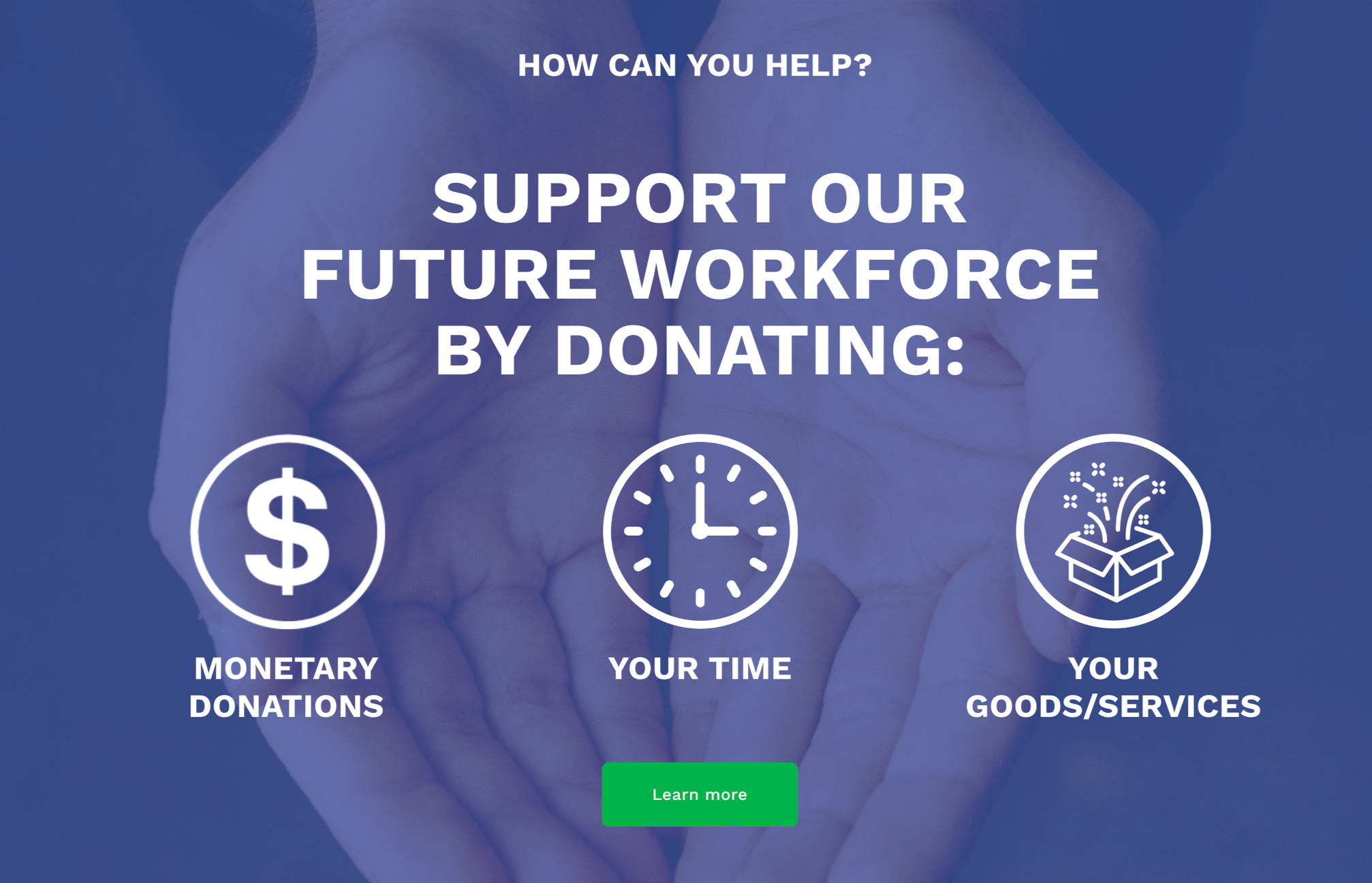 In another example, a donation section uses simple iconography to illustrate three ways supporters can contribute: