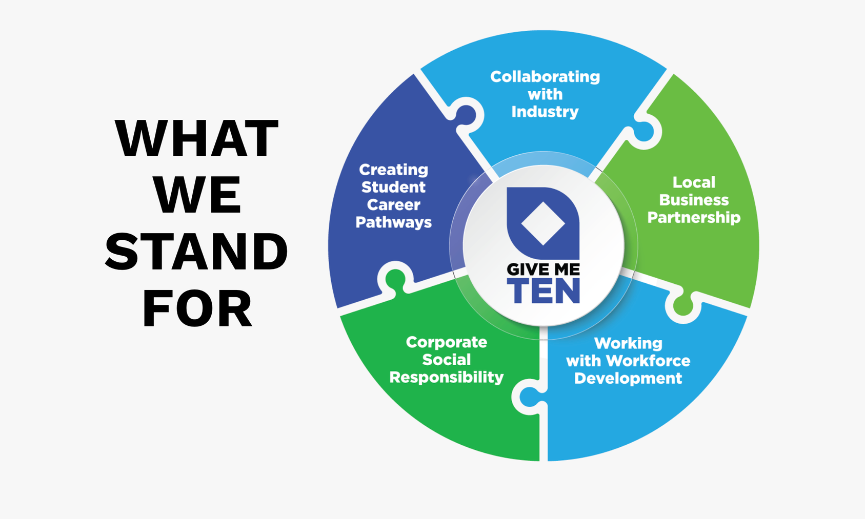 In one project, a circular puzzle-style infographic was created to represent an organization’s core mission and partnerships. Each segment illustrates a key component of their work, including: