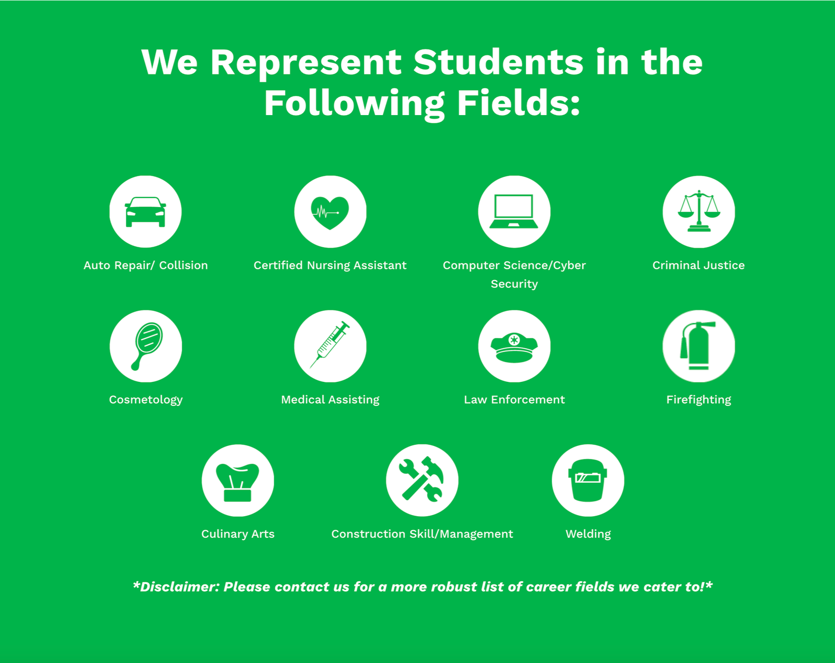 In one example, a structured icon layout visually highlights multiple career pathways supported by an organization. Each field—ranging from healthcare and public safety to construction and technology—is represented by a simple, recognizable icon.